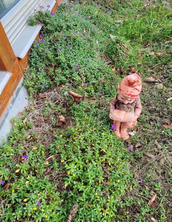 Die Krokusse blühen schon. Bei uns im Garten fühlen sich vor allem die Elfenkrokusse mit ihren zartlila Blättern. Sie vermehren sich von selbst und sprießen überall – auf den Beeten und auf dem Rasen, wo sie nach Meinung meines Mannes eigentlich nichts zu suchen haben. Auch immer mehr Blaukissen-Blüten wagen sich hervor. Bis sie aber ein blaues Kissen bilden, werden wohl noch einige Tage vergehen. Den Lesezwerg stört’s nicht; er ist so in sein Buch vertieft.