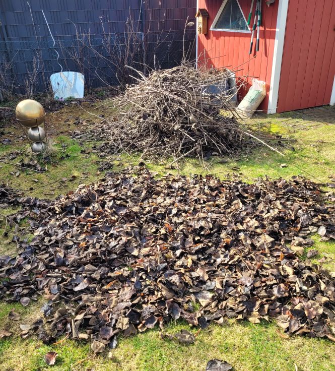 Das Hochbeet meines Mannes hat den Winter nicht überlebt. Es ist auseinandergebrochen und nicht mehr zu reparieren. Denn obwohl das Gestell mit Folie bzw. Vlies ausgekleidet war, waren die Bretter total morsch. Wenn wir sie nächste Woche In den Nachbarort zum Sperrmüll bringen, kaufen wir im Baumarkt ein neues Hochbeet. Beim Befüllen kommen dann die abgeschnittenen Zweige und ein Teil des Laubs zum Einsatz, die beim Frühjahrsputz angefallen sind. So schließt sich der Kreis