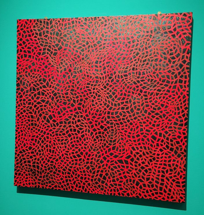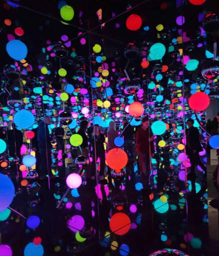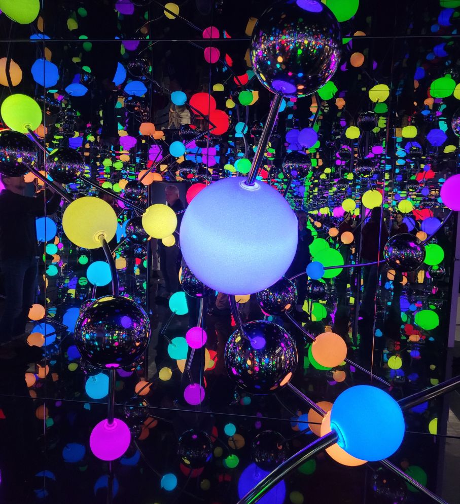 Am besten haben ihr die Arbeiten von Yayoi Kusama gefallen. Ihre (gepunkteten) Bilder sind wirklich etwas Besonderes – und der „Infinity Mirrored Room“ ist sicher das Highlight der Ausstellung. Etwa 40 Menschen standen vor uns in der Schlange und warteten geduldig mit uns, den kleinen Raum betreten zu dürfen. Etwa eine Minute durfte man dann drinnen bleiben – doch die genügte, um verzaubert zu werden.