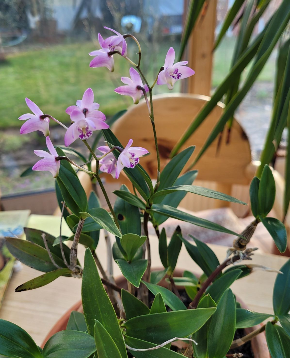 Weiß-lila blüht die Felsenorchidee, die ein Schulfreund meines Mannes mir im letzten April geschenkt hat. Nachdem ich seinem Rat befolgt habe und der Dendrobium Kingianum Angfang Februar eine Portion Blumendünger spendiert habe, zeigten sich schnell kleine, halbmondförmige Knospen. Auch auf Nachwuchs kann ich hoffen: Denn die Verdickung an einem Stiel ist ein „Kindel“, also ein Ableger: Da er inzwischen drei eigene Blätter und auch zwei gut ausgebildete Wurzeln hat, kann ich ihn demnächst abtrennen und einpflanzen.