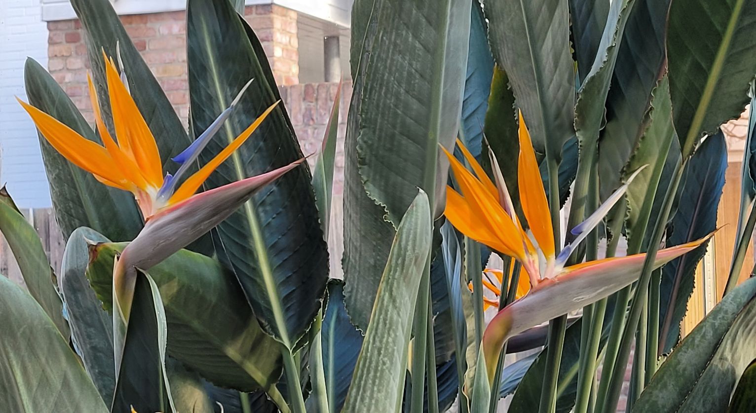 Keine Ermüdungserscheinungen zeigt die Strelitzie. Die ersten Blüten sind inzwischen verblüht, aber ihre Nachfolgerinnen schauen wie bunte Vogelköpfe zwischen den Blättern hervor und ziehen die Blicke auf sich.