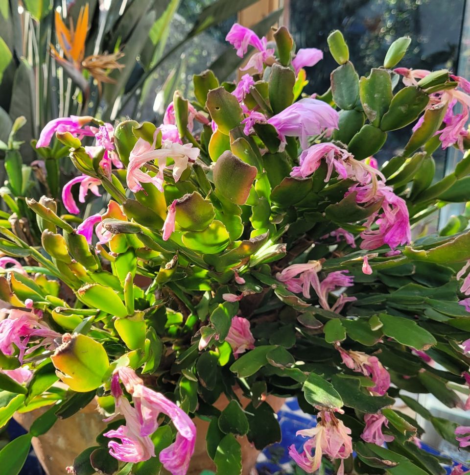 Während sich im Garten bislang erst wenige Pflanzen hervorwagen, grünt und blüht es im Wintergarten prächtig. Blickfang Nummer eins ist der Osterkaktus mit seinen rosa Blüten. Er blüht – seinem Namen zum Trotz – schon seit der Dezember und zeigt noch keine Ermüdungserscheinungen. Bis Ostern wird er es aber kaum durchhalten.