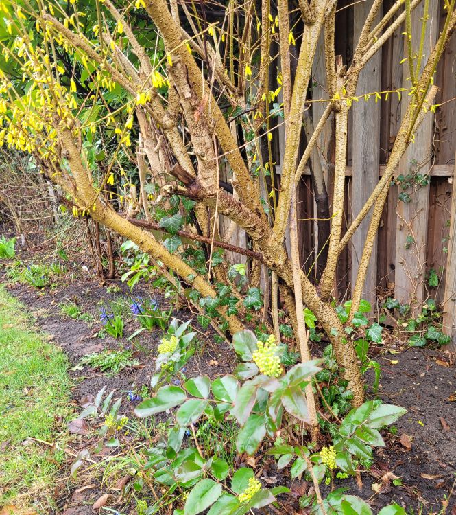 Für gelbe Farbkleckse im Garten sorgen die Narzissen, Forsythien und die kriechende Mahonie, die sich ungefragt überall im Garten ausbreitet. Am Teich ist meine einzige Primel wieder aufgetaucht, von meinen Veilchen ist dagegen noch nichts zu sehen. Die Zeit der Krokusse ist dagegen vorbei, Wind und Regen der letzten Tage haben ihnen wohl den Rest gegeben.