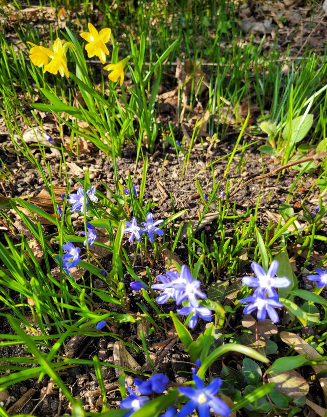 Auch die Blausternchen haben meine Geduld auf eine lange Probe gestellt. Auf unserem Nachbargrundstück blühten nämlich jedes Jahr hunderte, auf unserem kein einziges. Es war, als gäbe es eine unsichtbare Grenze. Als das Haus abgerissen wurde, habe ich einige Zwiebeln ausgegraben. Aber erst nach zwei oder drei Jahren breiteten sie sich in unserem Garten aus. Und auch in diesem Jahr lassen die Blüten noch auf sich warten, ebenso wie Hyazinthen und Traubenhyazinthen.