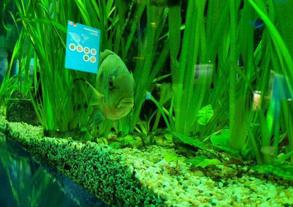 Besonders lange saß ich diesmal vor dem Becken mit einem einsamen Heterochromis multidens. Der afrikanische Buntbarsch, der im mittleren Kongobecken zu Hause ist, sah mit seinen herunterhängenden Mundwinkeln ziemlich traurig aus. Ob er seine Heimat und seine Artgenossen vermisst? Oder ob er nur ungehalten über die Besucherin war, die vor seinem Becken saß und ihn so neugierig anschaute.