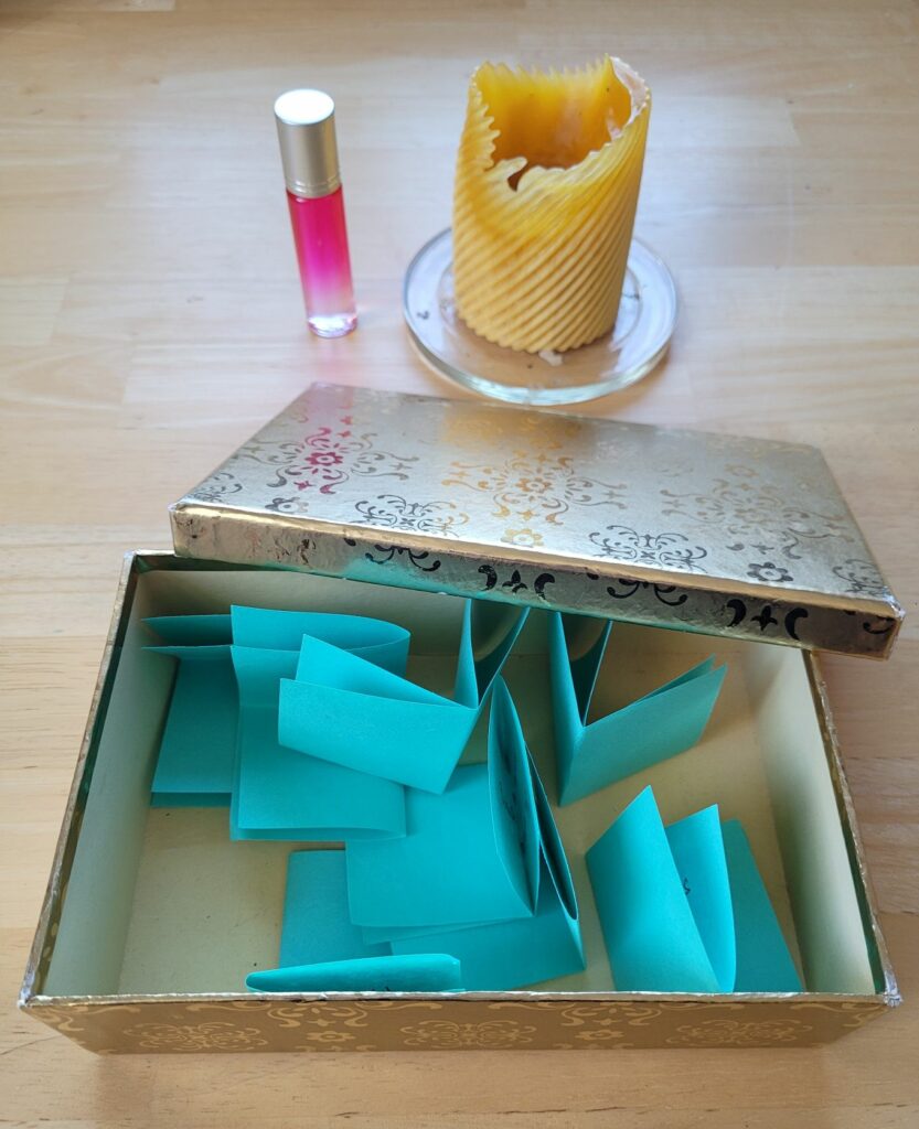 In diesem Jahr kehre ich also wieder zum gewohnten Ritual zurück: Ich ziehe jeden Abend einen Zettel aus meine 13-Wünsche-Box und übergebe ihn ungelesen dem Feuer und den höheren Mächten, statt ihnen ins Handwerk zu pfuschen. Sicher ist sicher.