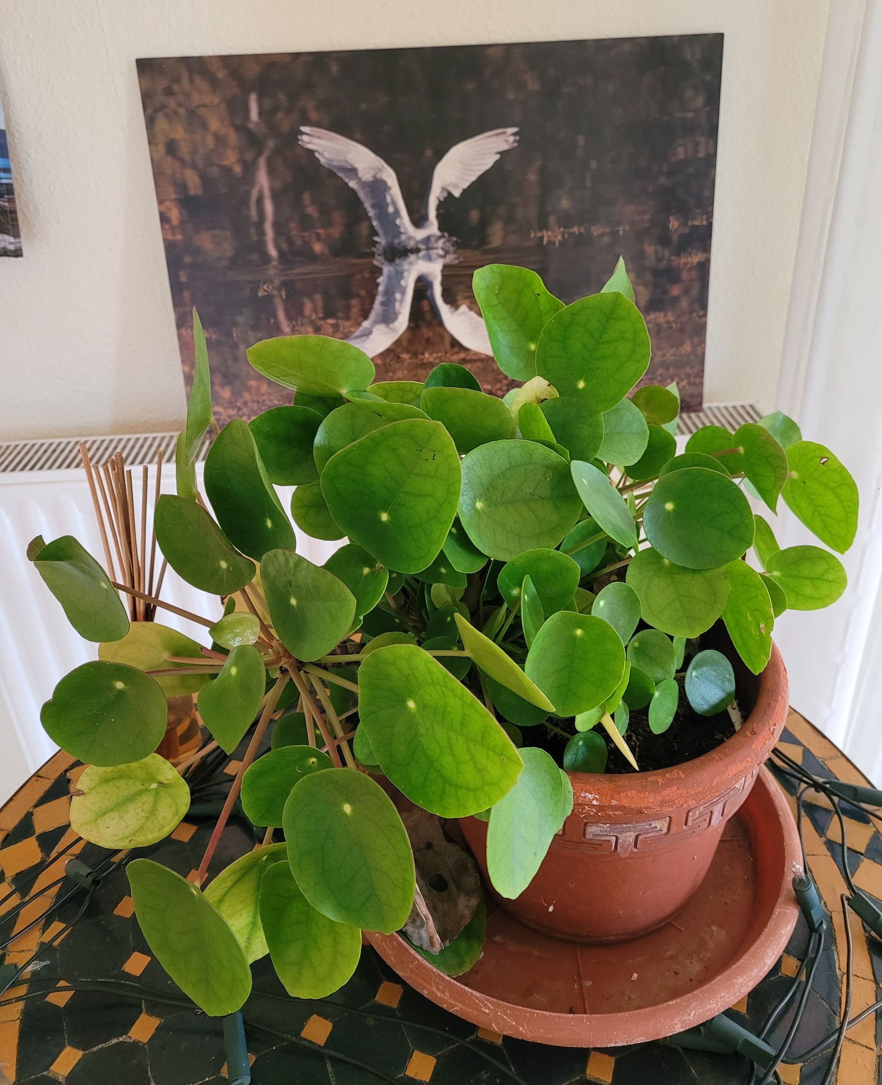 Damit, dass die Ufopflanze (Pilea peperomioides) den Sommer überlebt, hatte ich gar nicht gerechnet. Sie hatte im Frühjahr fast alle Blätter abgeworfen, sich aberwider Erwarten auf der Terrasse prächtig erholt.