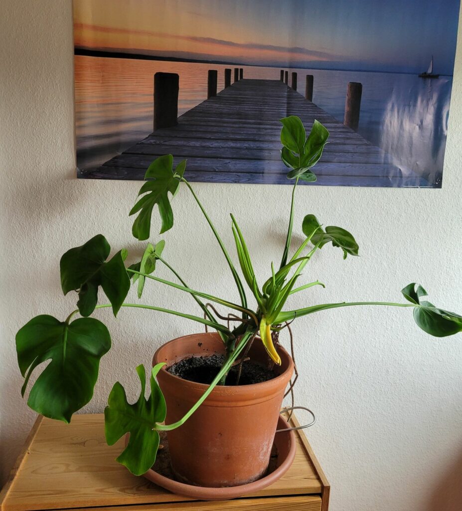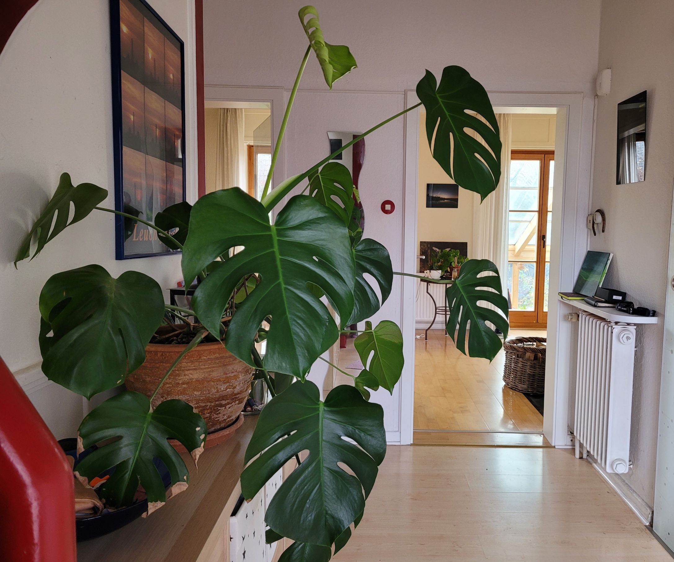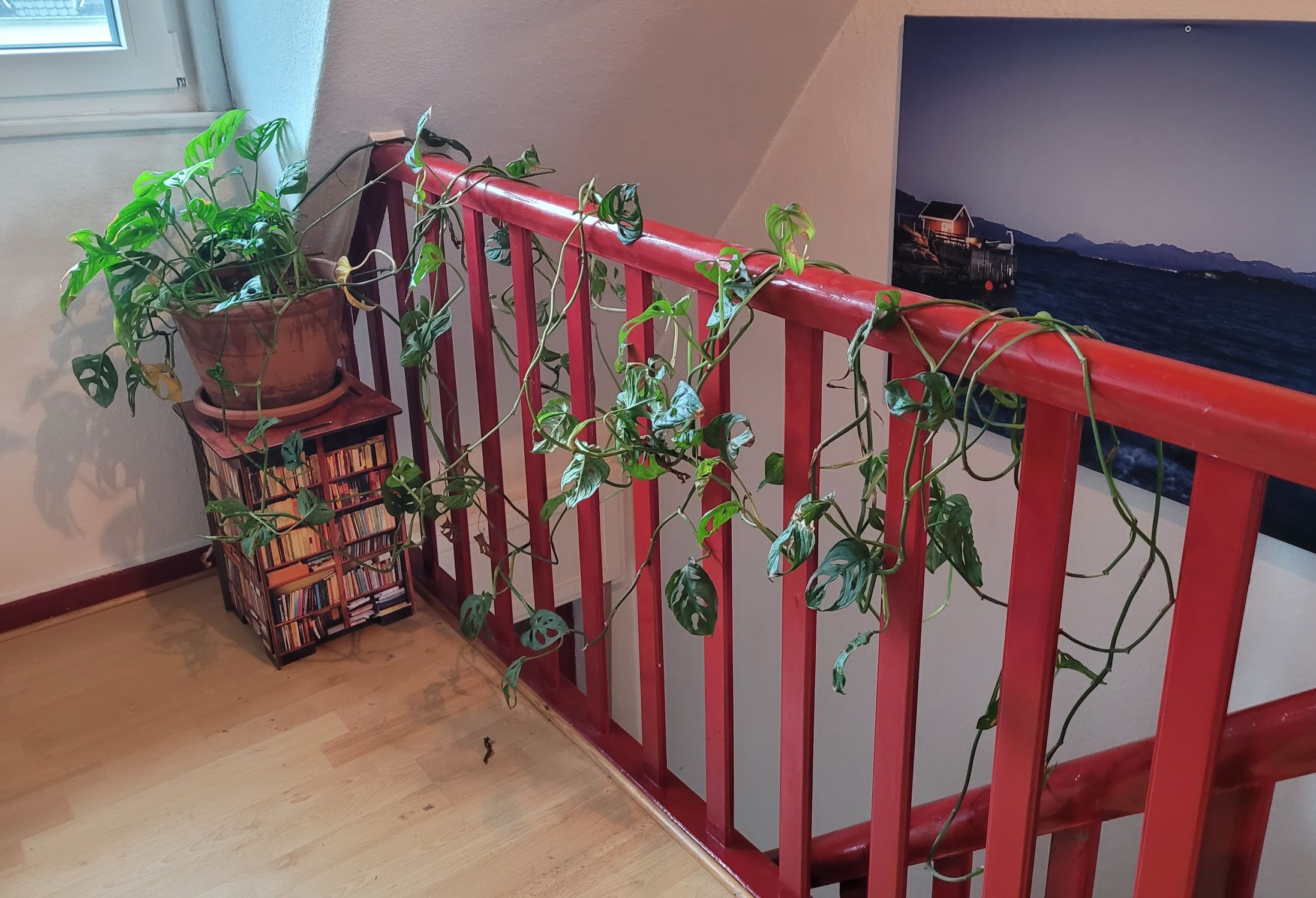 Ein Umzug steht auch der Monstera im Erdgeschoss bevor, die ihrem Namen alle Ehre macht: Sie wächst und wächst und streckt ihre Blätter weit in den Flur hinein und wird den Durchgang in die Zimmer bald versperren. Da sie keine Sonne mag und viel Platz braucht, kommt als Standort eigentlich nur die Empore im Obergeschoss in Frage. Dort fühlen sich schon ihre kleinen Schwestern und ihre Cousine, die Monkey Leaf, sehr wohl. Auch Letztere hat ein sehr einnehmendes Wesen. Und vielleicht entsteht dort, wo jetzt noch meine Yogamatte liegt, schon bald ein kleiner grüner Urwald.