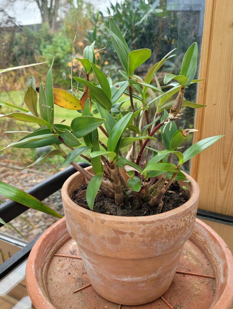 Auch die Felsenorchidee, die ich im April geschenkt bekommen habe, hat sich auf der Terrasse gut entwickelt: Anders als den meisten Orchideen machen ihr weder direktes Sonnenlicht noch Temperaturen nahe null etwas aus. Blühen wird sie voraussichtlich erst ab Dezember – wenn es mehrere Wochen um die zehn Grad kühl war.