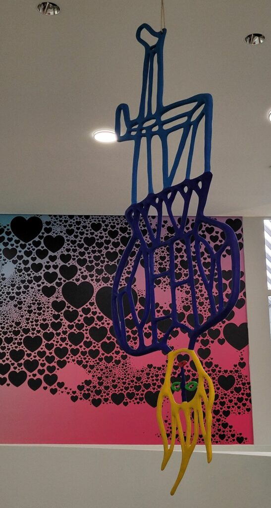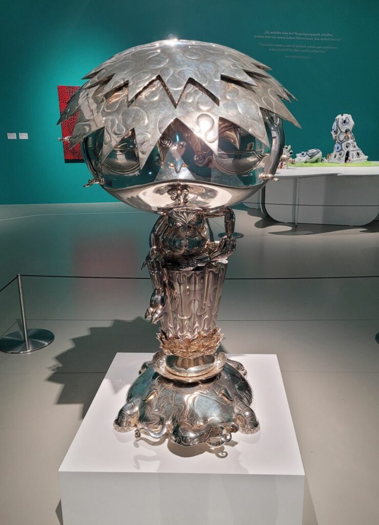 Ihr Landsmann Takashi Murakami verbindet traditionelle japanische Kunst mit zeitgenössischen Themen aus Popkultur und Konsumwelt. Die Arbeiten der beiden JapanerInnen passen sehr gut zu Niki de Saint Phalles farbenfrohen Werken. Oder, wie der Direktor des Sprengel Museums, Reinhard Spieler, es fachmännisch formulierte: „Diese Ausstellung bringt drei Ikonen der Kunstgeschichte zusammen, die auf ganz unterschiedliche Weise universelle Themen berühren und dabei Brücken schlagen – zwischen Kunst, Popkultur und gesellschaftlicher Reflexion.“ Mich hat die Ausstellung wirklich begeistert, auch wenn ich – siehe oben – nicht mit allen Werken etwas anfangen kann. Und weil Bilder mehr sagen als Worte, lasse ich hier einfach Fotos sprechen.